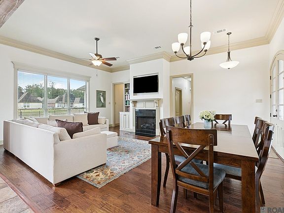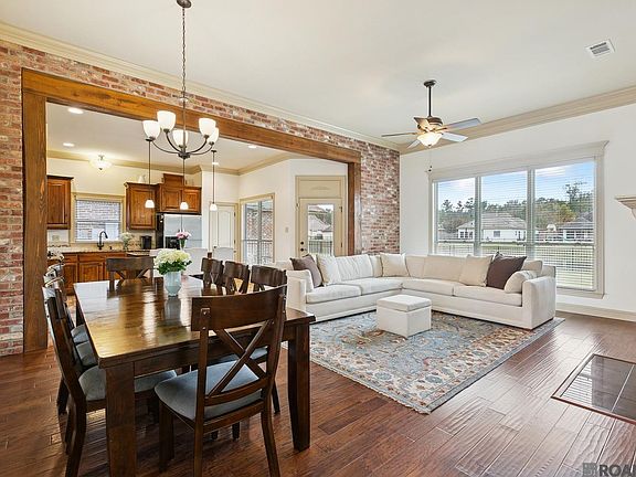 Spectacular 3 bedroom, 2 bath waterfront home in Burlington Lakes Subdivision. Open floor plan with fantastic views of the water from all angles of the common areas. Fantastic natural light. Gourmet kitchen features custom cypress cabinetry, slab granite countertops with large island, gas stainless steel range oven, almost new stainless dishwasher and microwave. And there is a large pantry! Large cypress beam and brick accent wall separates kitchen from large livingroom/dining room area. Beautiful hand scraped wood flooring in living and dining room with crown molding. Gas log fireplace with beam mantle is already set up for tv mount. Enjoy entertaining in kitchen, living and dining room and enjoying the waterfront views both day and night. Primary suite is split from 2nd and 3rd bedrooms. Spacious bedroom featuring trayed ceiling with ceiling fan. Spa-like bath has custom built 4' separate shower, dual vanities with great cabinetry storage and deep jetted soaking tub. Huge walk-in closet! 2nd and 3rd bedrooms are spacious with great storage space. 2nd bath features granite countertop with custom cabinetry, tub/shower combo. Deep covered porch with additional patio area overlooking water and fully fenced yard. NEW ROOF COMING NEXT WEEK! New paint inside and out and updated light fixtures. Subdivision features sidewalks, curb and gutter, street lights, great community featuring fantastic schools—ranked 5th in state of Louisiana.