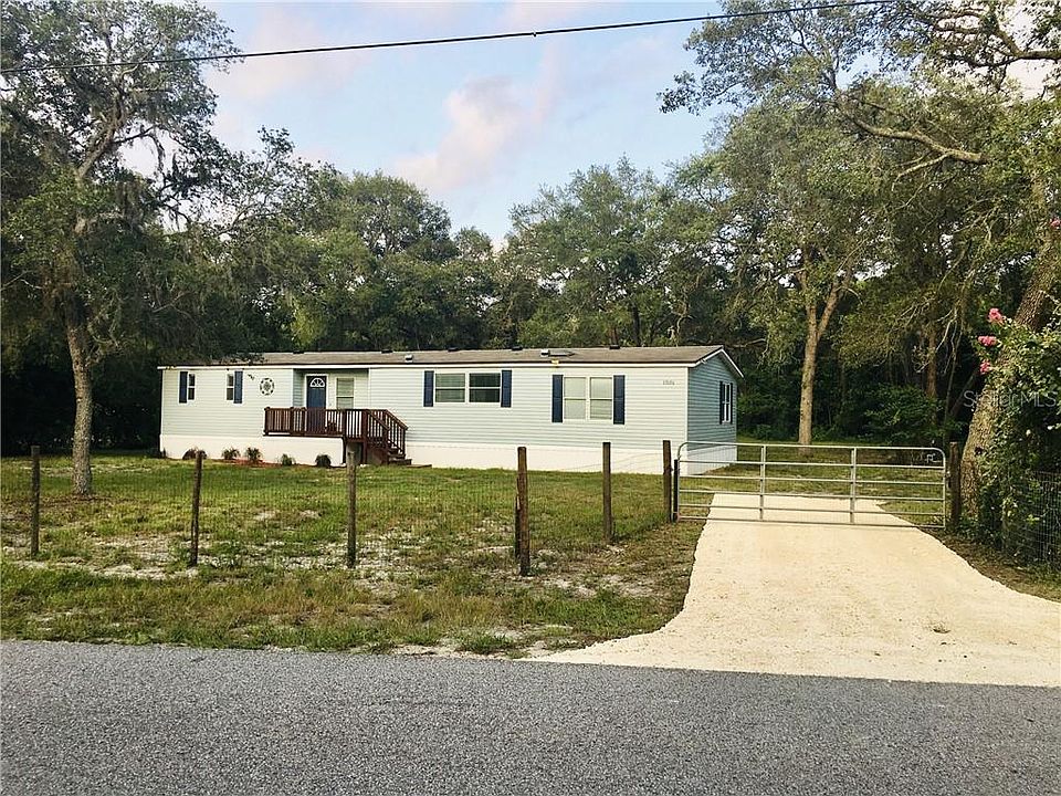 This immaculate remodeled 1+ acre beauty on a paved road has the features everyone is looking for... Huge open floor plan, spacious kitchen with an island, completely fenced and gated on a corner lot with mature live oaks. Throughout this tastefully upgraded property are new easy-care laminate floors (no carpet), new paint inside and out, new well pump and reservoir, new lighting fixtures, new glass backsplashes, new beautifully textured walls, new front and back decks and a new driveway. Newer GE appliances all stay. Relax on the back deck and enjoy nature, or gather family and friends around the new fire pit feature and make some memories. This property has so many possibilities. Manufactured by Palm Harbor Homes, the name brand respected in the industry because they are built to better standards. This one is a must see as it shows like a model.