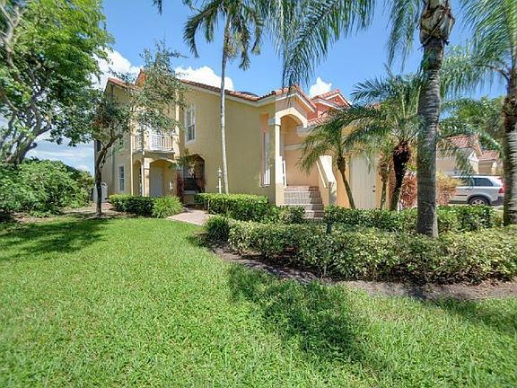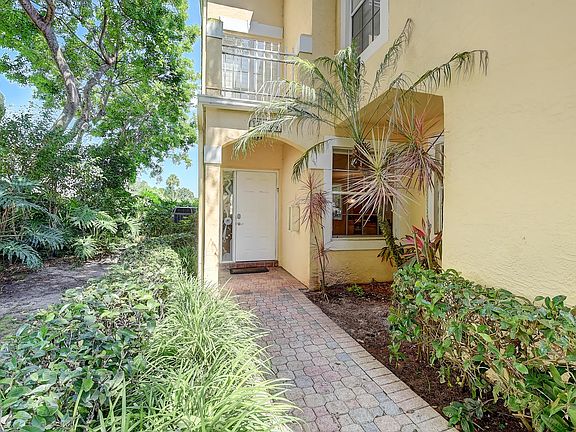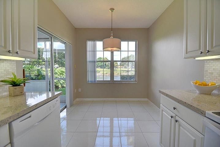 Premium location with great view of the golf course, SW exposure invites sunlight & fills the open floor plan home with light. In demand 1st floor end unit with extra windows. Two bedrooms PLUS separate den (can be easily converted to 3rd bedroom), tiled throughout-new carpet in primary bedroom. Eat in kitchen offers white cabinetry, Cambria quartz counters, marble backsplash, under cabinet lights, large primary bedroom w/2 closets, screened patio w/gorgeous views of the golf course, pond & fountain. Full size washer/dryer in laundry room, 1 car garage w/hurricane impact door. This is a wonderful all ages community, pet friendly (no size limit). Residents can enjoy golf & tennis w/no membership. Manned security entry gate. Great location-close to I95, shops, restaurants, downtown, beaches