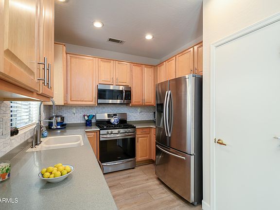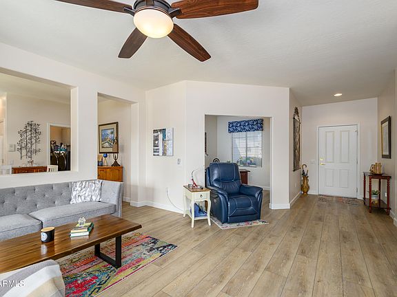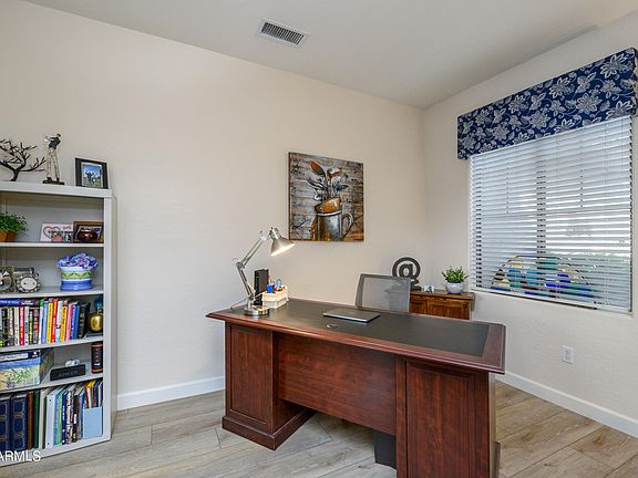 ARE YOU SEEKING AN EVERYTHING IS BRAN NEW PROPERTY? THIS IS IT!! NEW ROOF 12/2024! Great room boasts a new media wall with an elegant electric fireplace! Kitchen features corian counters, upgraded appliances, r/o system. LUXURY VINYL tile floors thru-out except for upgraded carpet in bedrooms. MBR boasts a barn door & bay window. New HVAC & WATER HEATER in 2024. Guest bedroom is extended with a bay window. Master bath updated, Dining area opens to Southwest facing covered patio, nicely landscaped yard with new pvc irrigation. fruit trees + it's walled for privacy. Laundry includes built-in storage & NEW washer/dryer. HOA for front yard maintenance/pest control. Don't miss this one!!