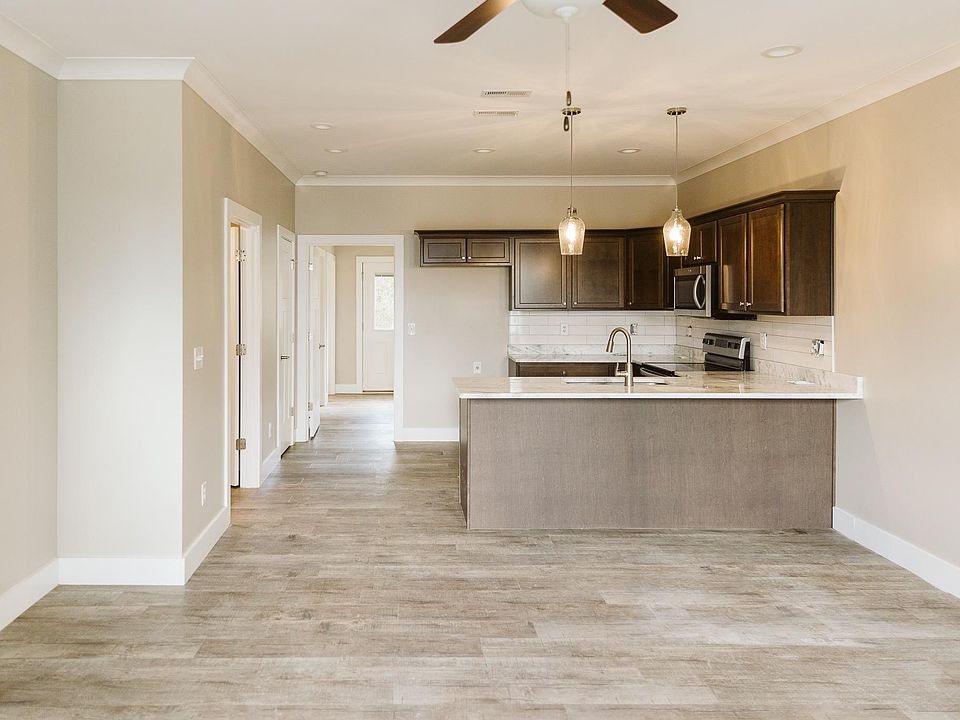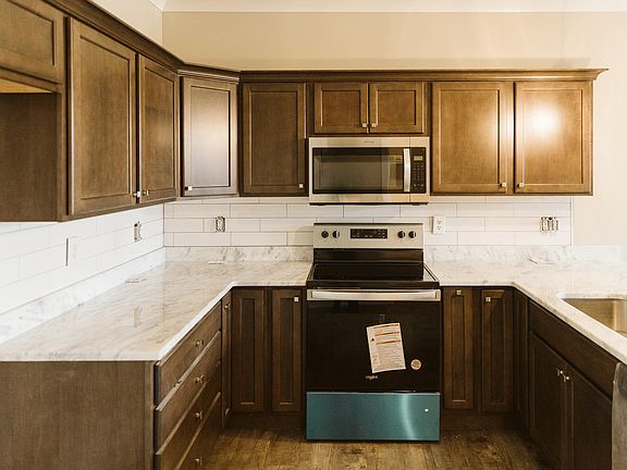This beautiful new construction features granite countertops and luxury vinyl throughout. The bedrooms are incredibly spacious and all have their own bathroom with an additional half bath off of the kitchen. The master suite is on the ground floor. Large windows allow for plenty of natural light. There is a small storage room off the back porch in case you need it, but each bedroom has lots of closet space. A refrigerator has been added since the photos were taken.