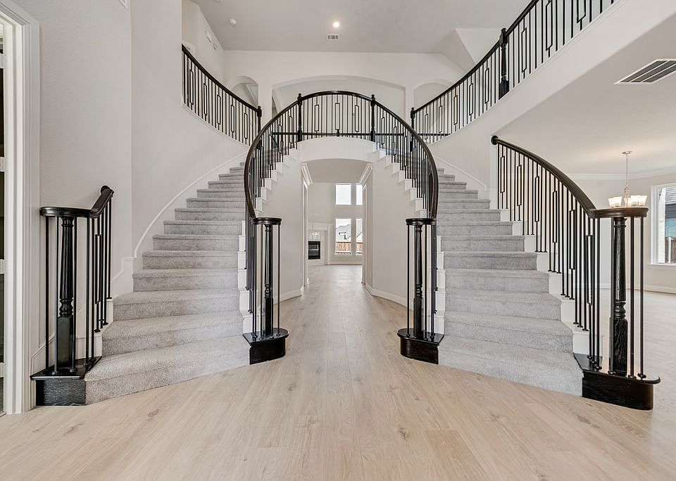 Step inside to an open-concept layout that’s ideal for everyday living and entertaining. A soaring, vaulted family room connects to a large, covered patio featuring an outdoor fireplace, a gas line for grilling, and pre-wired speakers—perfect for gatherings. The double staircase with wrought iron balusters adds architectural charm, while 8' interior doors and stylish lever hardware elevate the interior.