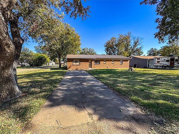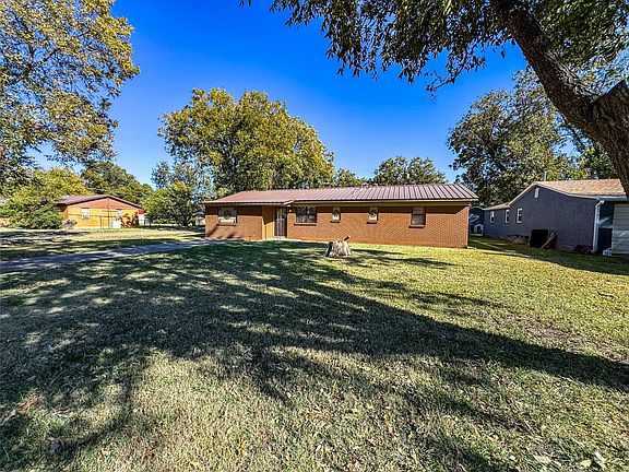Welcome home to this lovely three-bedroom, two-bath residence offering comfort, versatility, and classic curb appeal. Featuring a durable metal roof, inviting brick façade, and excellent landscaping, this property stands out with its shaded yard and generous outdoor space. Inside, you’ll find multiple living areas—perfect for a formal sitting room, playroom, home office, or media space. The kitchen comes fully equipped with all appliances and connects seamlessly to the cozy dining area. A wood-burning stove adds warmth and charm, especially during the cooler months. The primary suite includes its own private bathroom for added convenience, while two additional spacious bedrooms and a second full bath provide plenty of room for family or guests. Storage is no issue here—this home offers multiple storage rooms along with a completely covered cellar ideal for storm protection or extra storage needs.