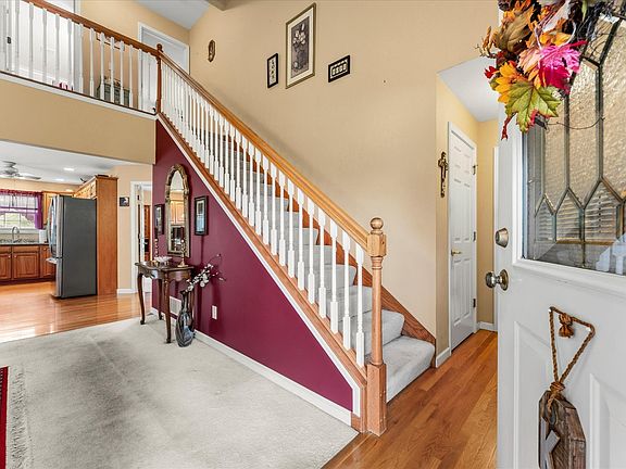 Welcome to this beautifully maintained 3-bedroom, 3-bathroom, 1.5-story zero-lot home near Lake of the Woods, offering scenic water views and spacious living throughout. The main floor features a bright living room with vaulted ceilings and a cozy fireplace, a large eat-in kitchen perfect for gatherings, a convenient laundry room, and a generous primary en suite with a walk-in closet. Upstairs, you'll find two oversized bedrooms with ample closet space and a full bathroom. The full basement expands your living options with a large finished rec room and an additional full bath. Enjoy relaxing or entertaining on the back deck with a pergola, all while overlooking the tranquil water.