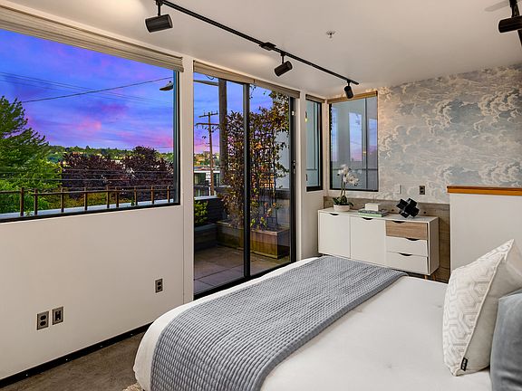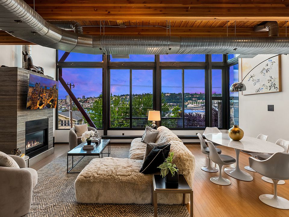 Fully furnished 3 bedroom, 3.5 bath townhome in Lower Queen Anne blends industrial design with Northwest contemporary sophistication. Situated within The Block, an exclusive boutique residential community, this residence offers 2,450 square feet of living space, complete with a private rooftop deck and a bedroom balcony overlooking a garden. Distinctive architectural touches such as board formed concrete, warm wood paneling, and steel framing enhance its urban chic character. Vaulted ceilings and expansive windows flood the interiors with natural light and frame sweeping views of Lake Union, Capitol Hill, and the Seattle skyline. The great room's dramatic 30 foot ceilings, built in seating, and sleek gas fireplace create an inviting yet refined focal point.