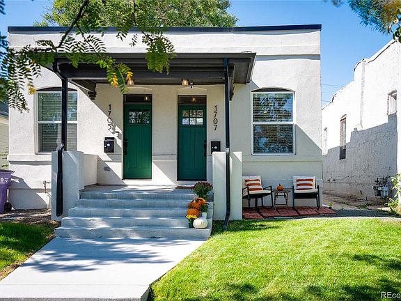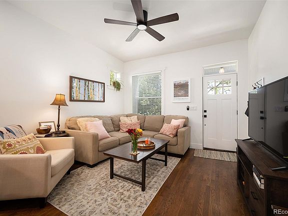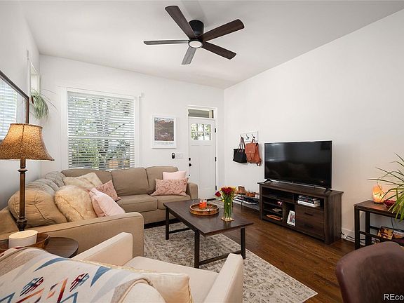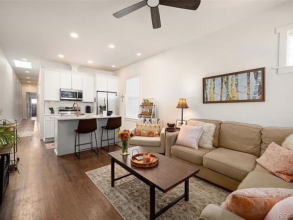 This newly remodeled duplex is dripping with charm! Curb appeal galore with a sweet front porch and seating area. From the moment you walk into this home you are greeted with a light and bright welcoming space. Updated less than a year ago the home features pristine dark wood floors throughout the main level and an open concept floor plan. The skylight brings in additional sunshine and adds to the airy feel. The kitchen is equipped with newer Samsung appliances and everything is within reach. The center island allows for counter seating. Two bedrooms, a full bath with built in storage, a laundry closet and a mudroom with additional cabinetry round out the main level. The basement space is comprised of a non-conforming bedroom and utility room/storage area. The backyard space is fully fenced and has a sweet patio on which to relax after a long day! The backyard also has a new shed in which to store your toys, bikes and yard equipment. There is an oversized parking space off of the alley as well. Motion activated lighting under the kitchen counters and basement stairs. New furnace, new central air conditioner, and a new french drain system have been added to make this home extra special. Turnkey perfection and close to so much ~ like Sloans Lake, the Broncos, bike paths to downtown and beyond, public transportation.