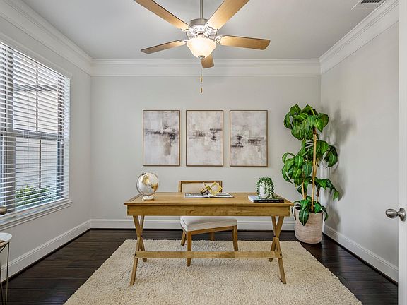 Home officeBeautiful lake viewWood flooringCustom built-insLarge windowsQuartz countertopsFormal dining