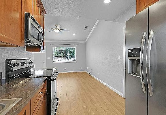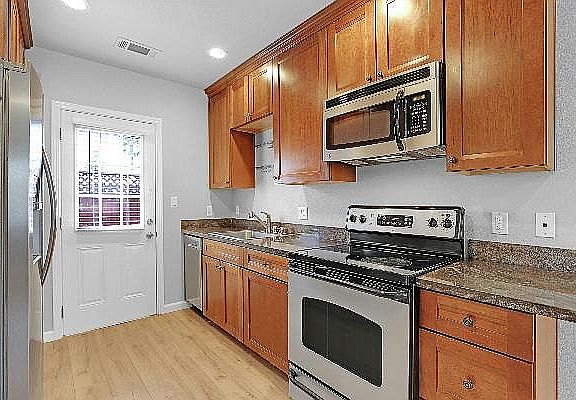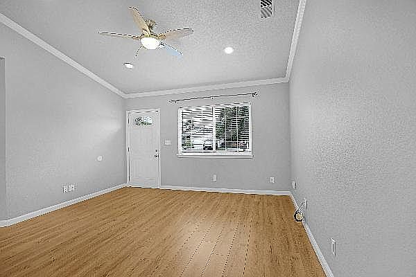 -Vaulted ceiling in living room. High end ceiling fans in every room. Slider door in master bedroom goes out to private trex deck perfect to set up a small entertaining area. The two places you would want to hang a flat screen are all set up to run your cables. The living room has surround sound speakers just waiting for your flat screen and receiver to hook up! Crown molding and base throughout the entire interior. -1 car attached garage plus another space in the driveway and 2 more spaces in front of the house. Lots of parking not a problem here! In the garage is even more storage with overhead shelving and a pull down ladder that goes into a mini loft area sheeted with plywood. Garage floor has industrial carpet and pad in case you want to turn it into another room, office or play area. -Over sized bathroom not typical for a smaller place like this, ample vanity space and lots of room in the bathroom! Xtra large linen storage closet right where you need it. Large bathroom vanity with custom mirror. Large tube light in bathroom ceiling flooding it with natural light during the day! -The hot water in this unit comes from a flash hot water system, no hot water tank so you never run out of hot water. The a/c and furnace work amazing cooling the place down and heating it up in minutes. -The kitchen: Gas stove and new double wide stainless fridge with ice maker and filtered water. Built in microwave, granite counter tops, lots of cabinet space, a mini dishwasher and a tube skylight so the kitchen is always flooded with natural light! -All the light switches throughout are on dimmers with new LED can lights. Separate switch inside the house controls 3 security motion lights around the property. Reading light and switch over bed area with USB outlet built right in. -The backyard is fenced and private with a gate going to the side yard. The side yard has two garden planter boxes ready for a small garden. The entire property is surrounded by a nice looking white vinyl fence. All the plants, trees and bushes are on drips and sprinkler timers. Terms are as follows: $3000 per month, $2,500 deposit plus $500 with pet