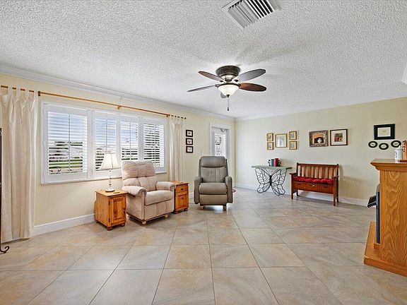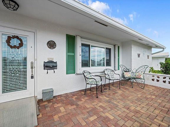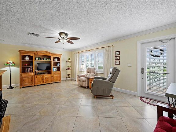 Welcome to your dream home in the heart of a vibrant 55+ community! This beautiful 2/2 home boasts a large floor plan with tons of space for entertaining family and friends. Step inside to discover a meticulously maintained interior featuring tile throughout. The spacious living area includes elegant crown molding for a touch of sophistication. Natural light pours in through the impact windows providing both security and energy efficiency while plantation shutters offer an extra layer of privacy and charm. The kitchen and dining areas seamlessly connect to the living space and offer an abundance of cabinets to store all your culinary needs! French doors open to your screened in patio to relax and enjoy the weather. The community offers a range of amenities and the best in active living!