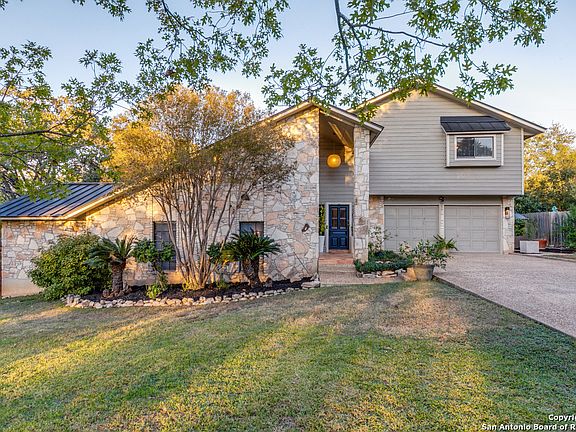 Beautifully appointed split level with mid-century aesthetic and close proximity to McAllister Park. Unique floor levels offer a sense of openness with a flexible layout of distinct spaces. Neutral paint palette compliments vintage "hex" Saltillo tile with glazed Spanish tile accents, stained tongue and groove ceilings, clerestory windows, arched openings and custom built-in cabinetry. Kitchen has stained cabinetry with tile counters, decorative splash, stainless appliances, and connection to large living area with wet bar and stone fireplace. Primary bedroom with en-suite has decorator color palette and sense of privacy. Second floor supports two additional bedrooms and a flex space that can function as an office, exercise room, playroom, bedroom, etc. The exterior is outfitted with a stone facade and an attractive metal roof, and the backyard oasis with in-ground pool supports ample entertaining space with patios, oversized wood deck area, and recent landscaping overhaul.