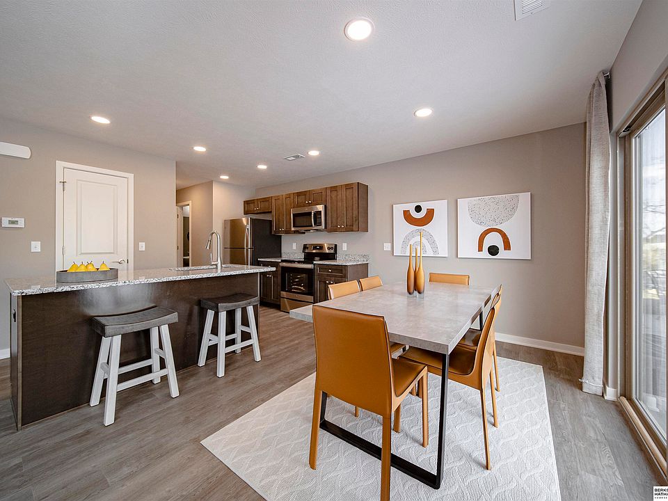 The Townhomes of Village Pointe by OMAHA EASY LIVING. Affordable living with high end finishes. 2 story townhome. ALL appliances including WASHER/DRYER, FRIDGE. Open living/dining/kitchen with large pantry. 3 bedrooms, laundry and storage upstairs. LVT throughout main & low profile designer carpet up. Agent has equity. Monthly HOA fee of $110 incl. lawn, snow, trash. INVESTOR & AIRBNB FRIENDLY!