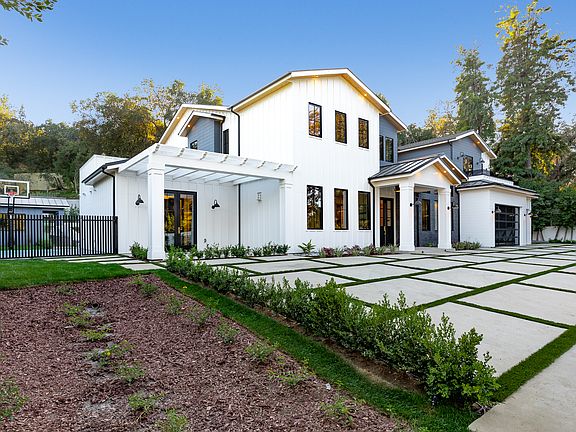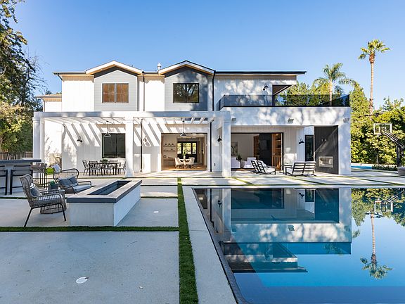 Exquisite new construction gated estate in a coveted enclave of Encino. Past the motor court and covered entrance with farm door, guests are greeted by a stunning two-story foyer and wide-plank European Oak floors. Flanked by a formal dining room and elegant formal living room, the Entertainer's floor plan continues with a temperature-controlled wine room, perfect for showcasing even the finest vintage collection. The gourmet Chef's kitchen boasts quartz countertops, 72-Inch Subzero refrigerator, and 60-inch 6 burner Wolf range with grill, griddle, and pot-filler. The inviting family room with contemporary fireplace and built-in bookshelves with storage. Oversized pocket doors open to an outdoor living room with fireplace and media hookups, perfect for al fresco dining. The well-appointed media room features chic paneled walls, while a spacious executive office has french doors to the front courtyard. Upstairs, the romantic master suite showcases a fireplace, incredible duel walk-in closets, and large wrap around balcony with views of the backyard. The massive spa-like master bath boasts soaring ceilings, large rain shower, dual vanity, and a soaking tub. Additional conveniences include Control 4 smart-home automation. The sprawling grounds feature a sparkling pool & spa, sport court, spacious elevated grass area and pool cabana with full bathroom. A true one-of-a-kind estate, near fine dining, shopping, & more.