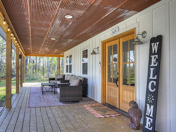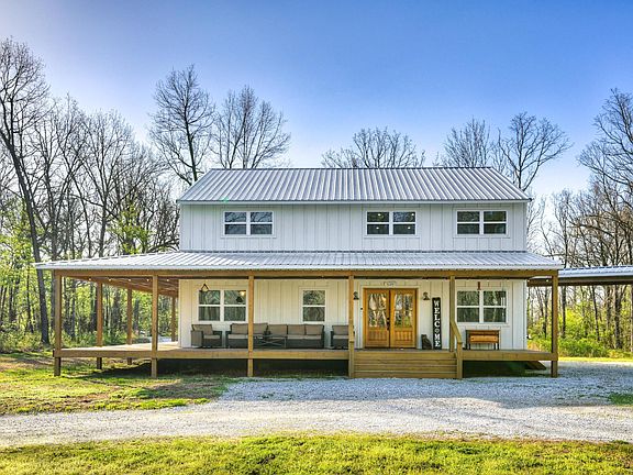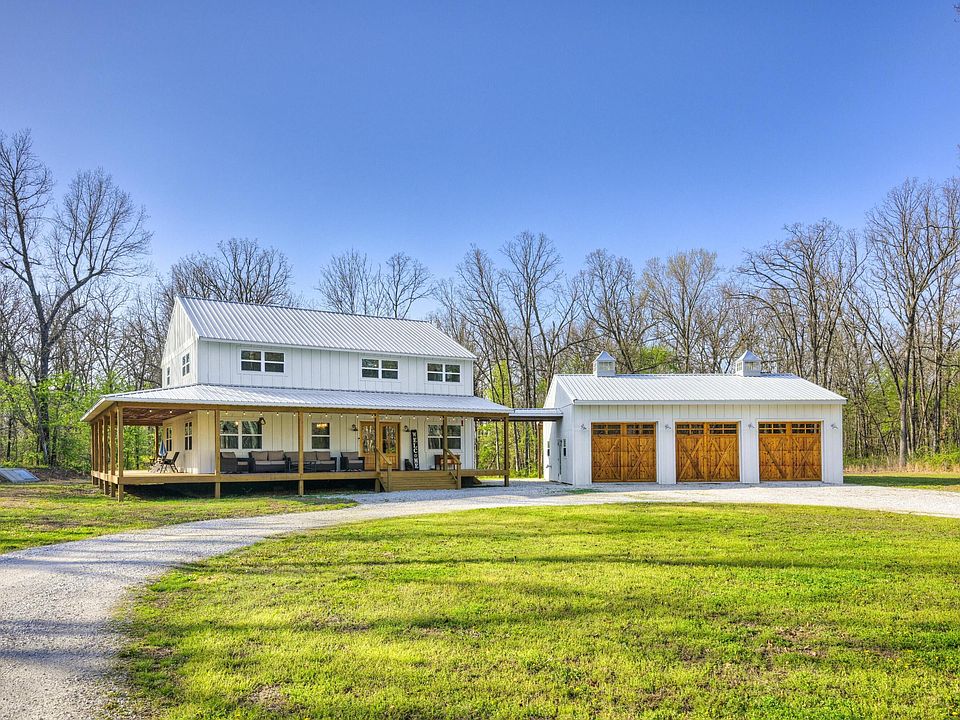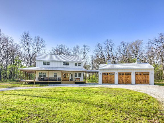 Welcome to Sweetwater Acres! Tucked away on 9+ wooded acres, this classic white farmhouse offers peace, privacy, and lots of charm! Enter through a solar-powered gate and enjoy your morning coffee on the 1,300 sq ft wraparound porch as deer graze nearby. The 3 bed, 2.5 bath home features soaring 30-ft ceilings, engineered hardwood floors, butcher block countertops, a vintage farmhouse sink, and a spacious walk-in pantry. The 600 sq ft upstairs master suite includes a walk-in closet, rain shower, claw-foot tub, antique vanity, and sunset views. Two additional bedrooms and 1.5 baths are downstairs, including a luxurious main bath with a quartz countertop, soaker tub and rain shower. Outside, the 30x40 shop features three 9x10 cedar doors, windowed cupolas, RV hook-up, 110/220 amp service, lean-to, and pellet stove. Both home and shop are finished with durable LP smart siding and metal roofs. Extras include dual HVAC systems, a storm shelter, and breezeway connecting the home and shop. Built in 2020, just 10 mins from Neosho and 24 miles to Arkansas--this peaceful retreat is ready to welcome you home!