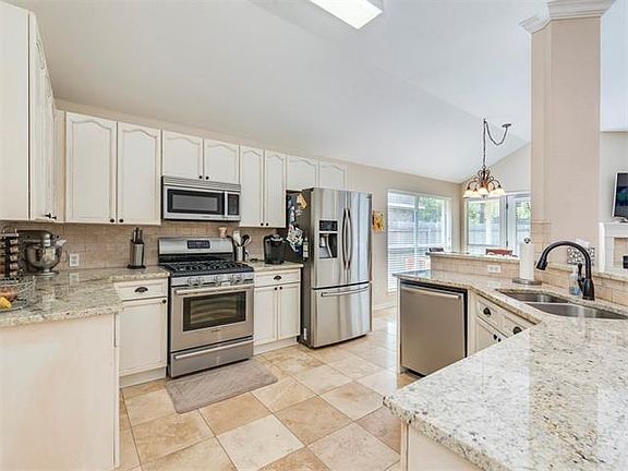 STUNNING 1 story, 4 bdrm home for sale with a fantastic floor plan and no wasted space. The large kitchen is open to large family room and fireplace, all with high ceilings throughout. Travertine, hardwood and carpeted floors are well maintained. Updates include designer paint, updated fixtures, level 4 granite, and a large deck overlooking a plush yard. This semi cul-de-sac lot w/low traffic in a family friendly area is walking distance to shops, trails, park & two swimming pools a plus!!