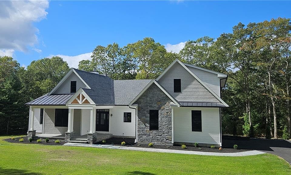 Looking for new construction without the wait? This exceptional move in ready home is nestled on 2.76 PRIVATE acres. Designed for modern living, this sprawling 4-bed, 3.5-bath home offers luxury one-level living (2466 sq.ft) with thoughtfully curated finishes. Step into an open layout featuring hardwood flooring throughout the main floor, cathedral ceilings, and a propane gas fireplace. The heart of the home boasts custom dove white cabinetry with under mount lighting, a large 9ft. maple island with storage, quartz countertops and GE Cafe appliances. Oversized windows in the dining area frame peaceful views of the expansive backyard. A sleek black slider opens to a covered composite deck and paver patio below perfect for outdoor entertaining. The luxurious primary suite offers a coffered ceiling, a spa-like bathroom featuring his/her vanities, a soaking tub, shower, and a massive walk-in closet with direct access to the laundry room. Two more spacious bedrooms and a full bath are situated on the opposite wing of the home. Upstairs, you'll find a surprising 958 sq.ft. of additional space comprised of the 4th bed, full bath, and a flexible room-ideal for guests, a home office, or a media room. Future expansion is effortless with a fully plumbed walk-out basement ready for finishing. There's plenty of room to add an in-ground pool, pool house, or maybe even an ADU. This location provides easy access to Route 1 & 138, the Kingston Train Station, URI and all South County beaches.