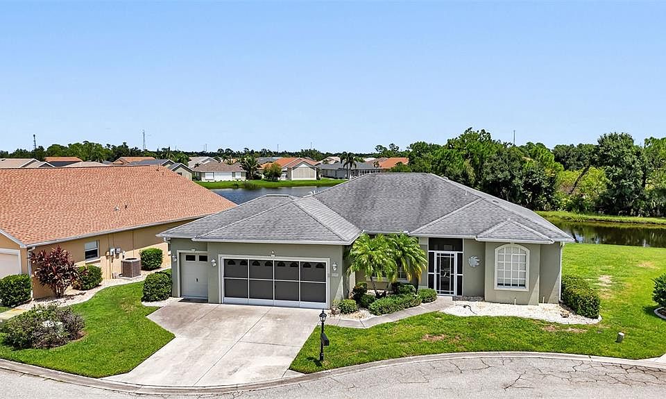 SENSATIONAL WATER VIEW from a MASSIVE enclosed and tiled lanai UNDER AIR in this gorgeous 2 1/2 car garage Bristol in the gated golf course/active resort of highly desirable Kings Gate, a 55+ community that does NOT require flood insurance and is in evacuation zone D - have not been under any evacuation order. This house is being sold TURNKEY and has had exterior freshly painted and new roof put on in 2025 (photos were taken prior to updates). The LANAI is so MASSIVE with such an awesome view - it needs to be experienced to truly appreciate all that it offers. Located in an ideal location - close to main gate and in cul-de-sac provides tremendous amount of convenience combined with privacy. NEW ROOF IN 2025, AC 2023, HWH 2021 - NO CARPET as this home features tile throughout. Kitchen with corian counters and cabinets with upper and lower pull outs to maximize storage. Central vac and a tiled and screened entry. Living room interacts nicely with dinning room - kitchen - and that MASSIVE LANAI. No question you're going to enjoy your morning cup of coffee and/or your favorite after dinner drink on that lanai soaking up the view. Great entertainment and/or relaxation options here. And with the split floor plan both you and your guests will enjoy the privacy that provides. And if you haven't been to Kings Gate before - you're going to love the options for activity (Olympic size heated swimming pool and spa, tennis courts, pickle ball, lawn bowling, shuffle board, bocce, horseshoes, gym, billiards, library, euchre, bingo, bridge, Texas hold em, poker, mahjong and more). The onsite AND NEWLY REMODELED Lions Den restaurant and bar is super convenient and also offers Tuesday night Karaoke and monthly trivia contests. Many residents love the fact that they are just a golf cart ride away from the shopping plaza that provides you access to grocery store, drug store, bank, restaurants and shopping. Want to explore outside of Kings Gate – you are minutes away from the restaurants and shops of downtown Punta Gorda and Fisherman's village. And if you want to explore more of Florida's fun spots you’re near I75 to quickly head north or south. An AWESOME home with an EXPANDED LANAI and SENSATIONAL VIEW in a PREMIER gated community won't last long. Call today for a private showing and a golf cart tour of the community/amenities.