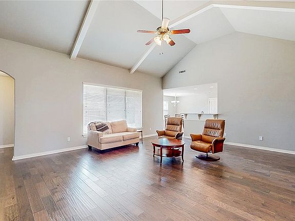The home offers wood floors in the main living area, tile in the kitchen and bathrooms, a recently installed microwave, and brand-new carpet in the bedrooms. An open floor plan with vaulted ceilings creates a bright, inviting atmosphere, while the spacious eat-in kitchen is perfect for gatherings. The home is also plumbed for central vacuum.