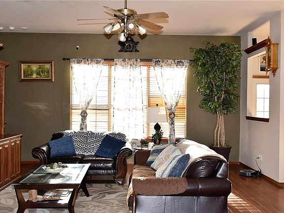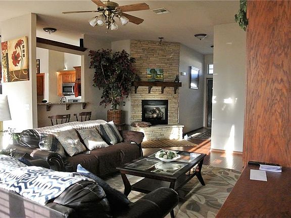 Great open floor plan with large living space and bedrooms. Upgrades include granite counter tops, SS appliances, Stone gas fireplace in living, wood laminate flooring. Energy saving screens on back windows, storage shed, above ground storm shelter in garage.