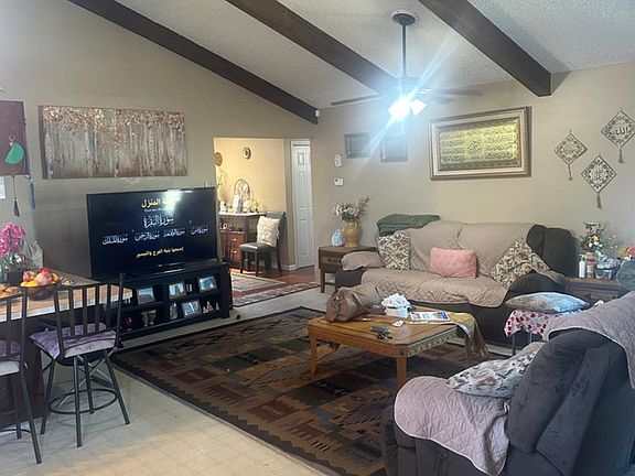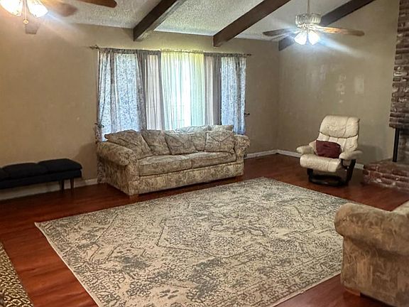Large 4 bedroom 2.5 bathroom cozy house with great floor plan and beautiful landscaping! Home faces kitty-corner on the corner lot and looks beautiful! Inside the great room is a high open beam ceiling, second large formal living room including a fireplace, laminate flooring throughout; Living room open to patio and large pool area. Priced to Sell, so make an offer today!