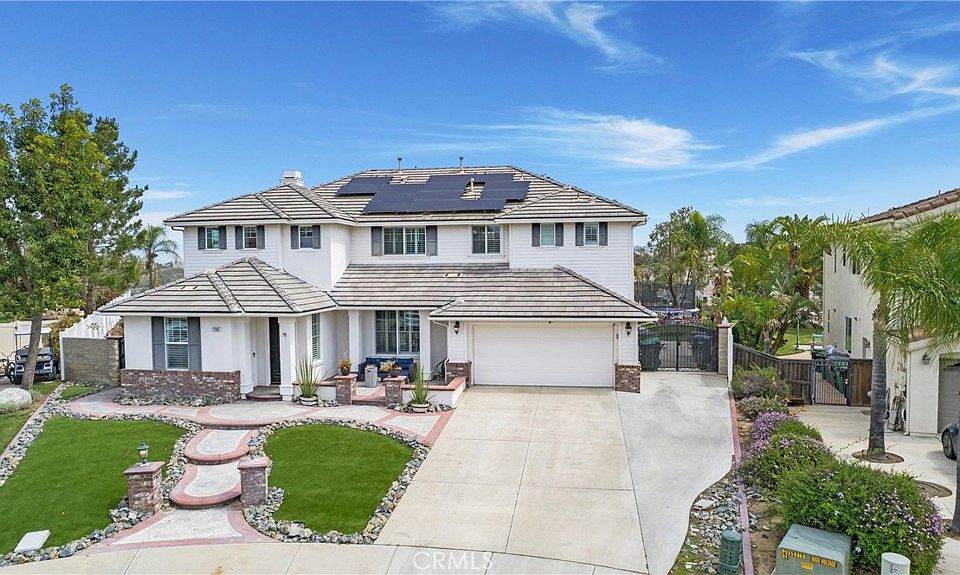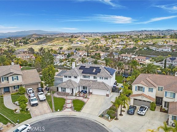 Nestled in the highly sought-after gated community of Victoria Grove, this beautifully upgraded home offers 5 bedrooms + bonus + spacious primary retreat. Situated in a quiet cul-de-sac on an expansive flag lot with nearly 15,000 sq ft, this property features breathtaking views of mountains and city lights. You are welcomed by the light and bright floor plan, two story ceilings, new LVP flooring, new paint and timeless stairway. Main floor includes an expansive main floor bedroom and remodeled bath with new vanity, quartz countertops, modern shower enclosure and stylish fixtures which easily accommodates a king bed + sitting area and perfect for guests or multigenerational living. Newly remodeled kitchen is designed for both style and functionality featuring large island with bar seating, an abundance of cabinetry, quartz countertops, a gas cooktop, double oven, microwave and built-in desk ideal for homework or working at home. Kitchen flows seamlessly into the nook, family room with fireplace, and dining room, which includes a walk-in wet bar with quartz countertops, floating shelves, and two beverage refrigerators. Primary suite is a sanctuary with the spacious retreat, stunning views, impressive walk-in closet, separate soaking tub and shower, separate vanities and updated lighting. Upstairs, two additional bedrooms share a beautifully upgraded bath with new vanity, fixtures, and mirrors. Large bonus room provides flexibility for entertainment or play. Practicality meets luxury with an upstairs laundry room equipped with cabinetry and utility sink. Backyard is designed for year-round enjoyment with a covered Aluma patio cover, TREX decking, filtered plunge pool, artificial turf, flagstone pavers, spa and panoramic views. This home makes a statement from the moment you arrive, featuring picturesque shutters, welcoming front patio, oversized driveway accommodating 6+ cars and gated RV parking. Additional upgrades include water filtration system, EV car charger, upgraded electrical panel, ceiling fans, LED lighting, new toilets, landscape drip system, two Nest smart thermostats, a Ring doorbell, garage overhead storage, outdoor shades and recently replaced water heater. Over $100,000 in upgrades in the past two years make this home move-in ready. Victoria Grove amenities include pool, spa, parks, Victoria Grove Fruit Stand and Blue Ribbon Lake Mathews Elementary located just outside the gates. Don’t miss the opportunity to make this exceptional home yours.