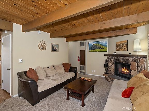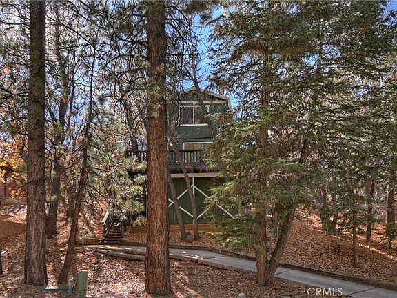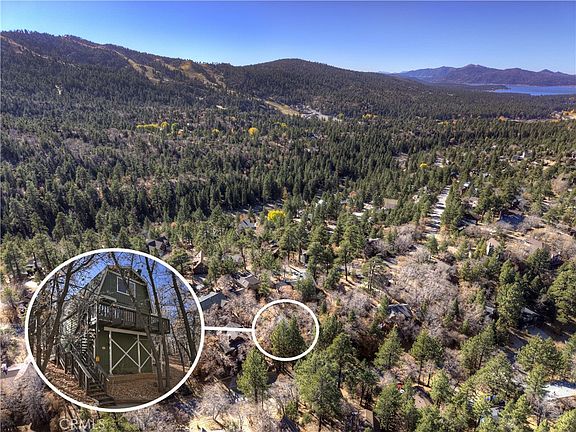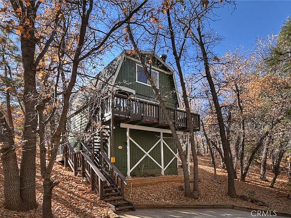 Don’t miss this charming 2-bedroom, 1-bath gambrel-style cabin nestled in the highly desirable upper Moonridge neighborhood. Elevated among mature oaks, this home offers a true mountain escape with a peaceful forest vibe—just one block from the National Forest. Step inside to a warm and welcoming living room featuring a cozy corner fireplace, perfect for relaxing after a day of skiing, hiking, or exploring the outdoors. The exposed beamed ceilings and tongue-and-groove wood add a rustic, inviting touch. The spacious kitchen has dining and a coffee station, and opens to a mudroom with laundry hookups and French doors leading to a private back deck. A full bathroom and linen closet complete the main level. Upstairs, you'll find two comfortably sized bedrooms with treetop views. Enjoy morning coffee or unwind in the evening on either the front or back deck, surrounded by serene mountain scenery. There’s also a large unfinished space beneath the house—ideal for storage or future expansion. Whether you're seeking a personal mountain retreat or an investment property, this well-priced cabin offers both comfort and potential. Escape the city and embrace the tranquility of Big Bear living - Just in time to enjoy the holidays!