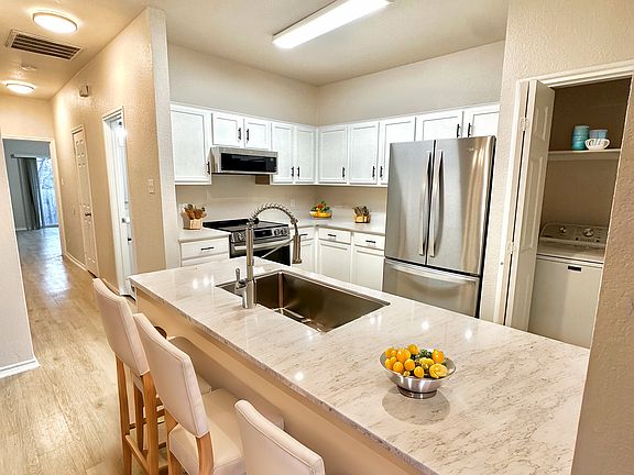Check out this charming 3-bedroom duplex in South Austin! With an inviting open floor plan, the spacious living room seamlessly flows into the kitchen and dining area, perfect for entertaining. Fresh interior paint throughout gives the home a modern, refreshed feel. The sleek vinyl plank flooring and tile in the bathrooms add to the clean, no-carpet appeal. The home also features stylish two-inch faux wood blinds throughout. The kitchen is a chef's dream with ample cabinet space, an electric range, stainless steel fridge, and a convenient breakfast bar. Updated lighting adds a contemporary touch throughout the space. Each bedroom includes a ceiling fan and stylish vinyl plank flooring. The primary bedroom is a true retreat with its own sliding glass door to the backyard and a walk-in closet. Don't miss the chance to make this beautiful duplex your own!