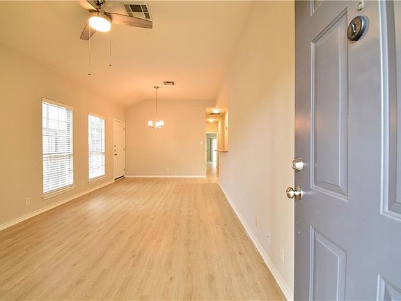 Lovely three bedroom duplex in South Austin. Open floor plan has the living room opening to the kitchen/dining area. The duplex has a fresh interior painting throughout. The flooring consists of recently installed vinyl plank and tile in the bathrooms. No carpet! Two-inch faux wood blinds are installed throughout the unit. The kitchen has plenty of cabinet space, an electric range, stainless steel fridge, and a breakfast bar. Updated lighting throughout. Each bedroom is equipped with a ceiling fan and has vinyl plank flooring. Primary bedroom has a sliding glass door for entry to the backyard and walk-in closet.