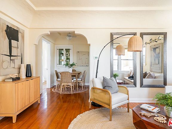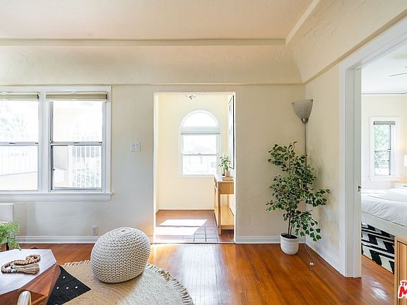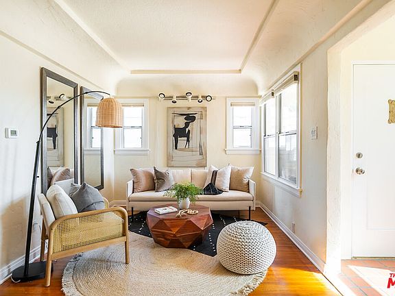 Don't miss this wonderful North Long Beach Spanish style home featuring a bonus garage space and a large backyard! Upon entering the front door of the house, you are welcomed by an entryway with beautiful terracotta tile and an arched window. The living room showcases the home's original charm with its coved ceilings and original hardwood floors. Abundant windows in the space allow for plenty of natural light. Beyond an elegant archway is the dining area, which offers convenient built-in storage. The dining area seamlessly connects to the kitchen, which is equipped with ample cabinetry and a stainless steel oven and fridge. The main house includes two light-filled bedrooms that share a full jack-and-jill bathroom. A door off the updated kitchen opens to the paved backyard, perfect for those seeking a low-maintenance property. French doors in the backyard lead to the bonus suite attached to the garage, featuring a spacious living area with a Murphy bed, built-in storage, laundry facilities, and a bathroom. Behind the 1 car garage and bonus room, is a large turf grass area, for lounging in the sun, family gatherings and quiet nights. Just one mile from Michelle Obama Neighborhood Library and Houghton Park, with Target, Walmart, and Trader Joe's located within three miles, all of life's necessities are nearby. This Long Beach home is a must-see call or text today to schedule a tour!