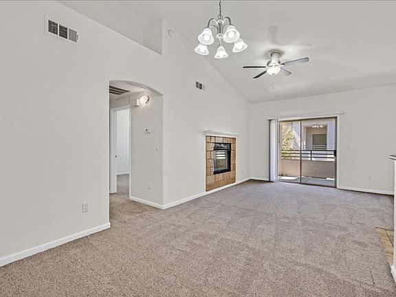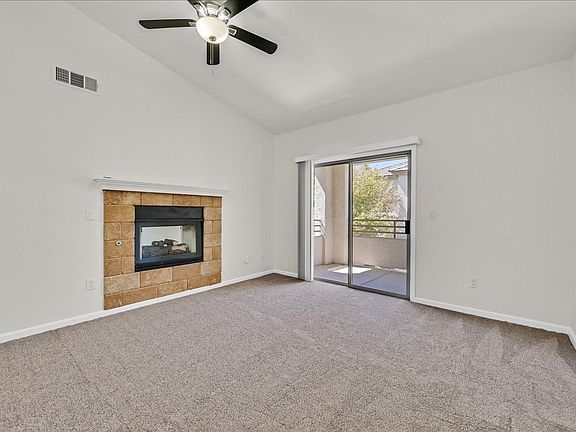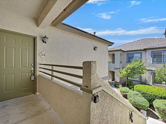 Move-in ready upstairs condo with fresh paint and new carpet throughout. Bright, open great room with vaulted ceilings, ceiling fan, and cozy fireplace. Kitchen with breakfast bar, stainless steel appliances, and ample cabinet space. Spacious bedroom with walk-in closet and full bath. Private covered balcony with storage closet. Full-size washer and dryer included. Well-maintained gated community offers pool, spa, and mature landscaping, conveniently located near shopping, dining, and freeway access.
