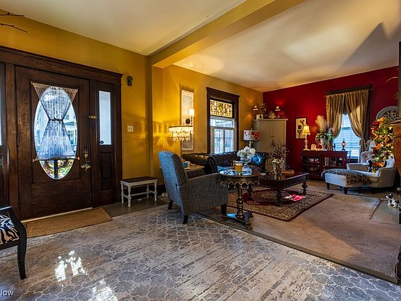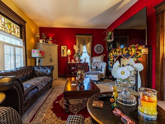 Beyond the living room, the formal dining area continues the charm with hardwood floors, another decorative fireplace, and a wide window seat perfect for quiet moments or conversation. The kitchen combines function and vintage appeal with tall windows, white cabinetry, tile countertops, and a mix of modern appliances, plus a nearby pantry that adds storage and personality. Upstairs, the primary suite features soft carpet, natural woodwork, a decorative fireplace, and an L-shaped walk-in closet connecting to a full bath with laundry and a jetted tub. The additional bedroom echoes the home’s creative feel with painted wood floors and another decorative fireplace.