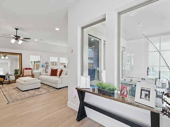 Wood mantel fireplaceBright open-concept floor planWall of windowsSpacious family roomDual vanitiesGlass-enclosed showerGenerous corner walk-in pantry