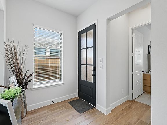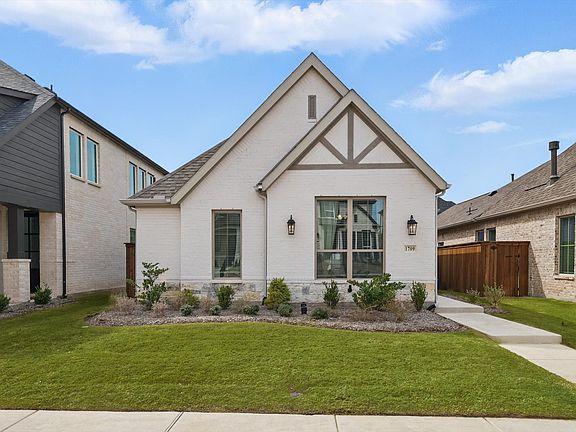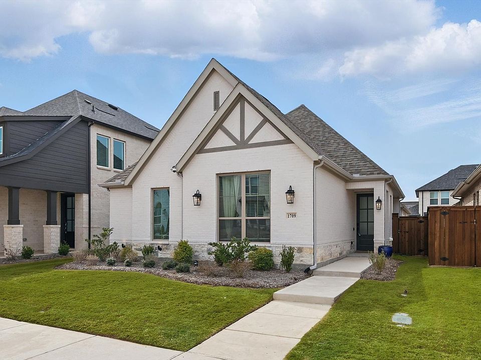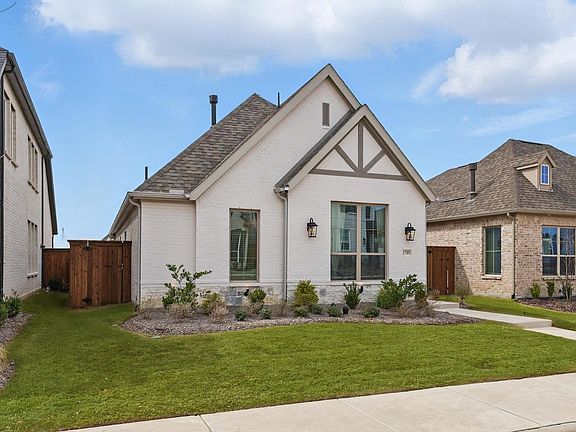 This charming home features a side door entry with a welcoming porch, leading into a bright, open-concept floor plan highlighted by a wall of windows. The spacious family room, complete with a wood mantel fireplace, seamlessly flows into the kitchen and dining area. The kitchen is equipped with a central island offering built-in seating and a generous corner walk-in pantry. The primary suite includes a well-sized bedroom with two windows, dual vanities, a glass-enclosed shower, and an oversized walk-in closet in the ensuite bathroom. Two secondary bedrooms, each with walk-in closets, are located towards the rear of the home. Step outside to the covered patio for added outdoor living space. A dedicated utility and mud room offer convenient access to the rear two-car garage, which also includes a storage closet.