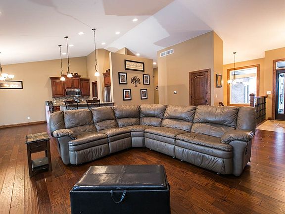 Situated on an acre lot in beautiful Waterford Estates is where you'll find this gorgeous custom built home. This 4 year old home features include a vaulted ceiling, split bedroom layout with 4 bedrooms on the main level, arched doorways, solid interior doors, a master suite with huge tiled walk-in shower, double vanity and walk-in closet. You'll love the beautiful hardwood floors, double tray ceiling, on-demand hot water, custom kitchen cabinets, pantry, tiled backsplash and granite counters. You can cozy up by the fireplace or outdoor fire pit. Also features a walkout lower level with lots of potential and decorative concrete edging around the home. A quality built home offering the feel of the country with city convenience!