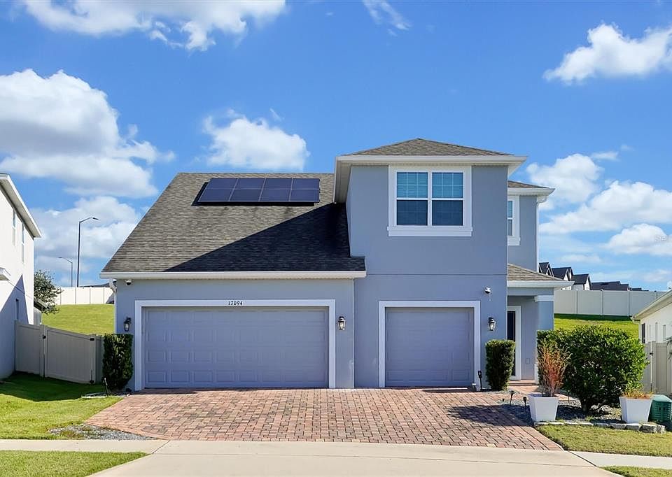 Stunning, move-in ready home in the Johns Landing area of Clermont! Sitting on a wide lot with a 3-car garage, this beauty features owned solar panels (low electric bills), a fenced backyard, and a screened lanai with extended patio, perfect for indoor/outdoor living. Light and bright kitchen with white cabinetry, quartz-style counters, large farmer sink, stainless steel appliances, subway-tile backsplash, and an island with seating that opens to the great room and dining nook. Fresh interior & exterior paint and new upstairs flooring give the home a crisp, modern feel. Spacious bedrooms plus a huge upstairs bonus/loft for media, play, or home office. The primary suite offers a double-sink vanity and oversized walk-in shower. Brick-paver driveway and walkway, tasteful landscaping, and plenty of yard space. Convenient to shopping, dining, and major routes. See it today and fall in love with Clermont living.