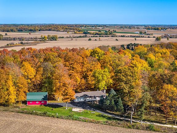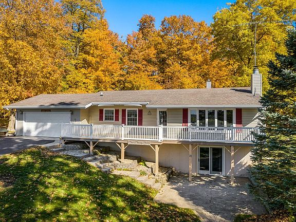 Beautiful SCENIC views from the hilltop! This charming home boasts nearly 10 ACRES of gorgeous woodlands/tillable land (zoned ag) and a stunning LAKE VIEW. Picturesque views can be seen from the maintenance free front deck or the quaint gazebo. This updated, 2 bd, 1.5 bath home has over 2,000 square feet of finished space and features a modern kitchen with solid hickory, soft close cabinets and solid surface counters, an eat-in island and SS appliances. French doors lead to the main level living room which opens to a cozy fireplace and gleaming, hardwood floors. Both bathrooms boast beautiful granite counters and the main bath features two glass bowl sinks, a jetted tub and a tiled step-in shower. The cabin style decor enhances the tranquil feeling of the property. A finished, walk-out lower level offers additional space as a family room and includes two additional rooms which can be used as hobby rooms, home offices, playroom, etc. The two-story, 36 x 24 OUTBUILDING with electric service is a great work space or is perfect for storing your toys! Additional parking pad. 2 car garage with epoxy floor! Well pump (2019) and septic (2019), furnace and central air (2020), hot water heater (2020), dishwasher and refrigerator new in last 4 years. Electric to gazebo.