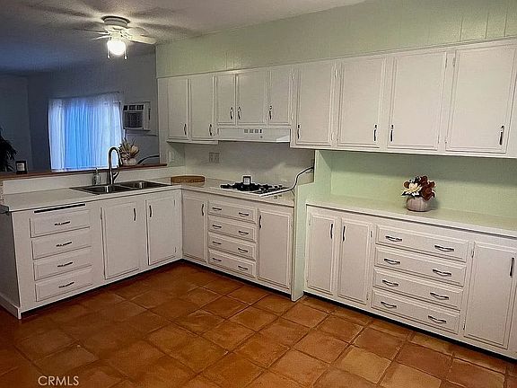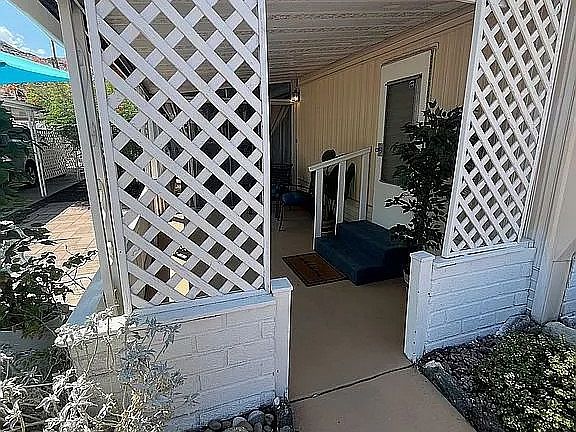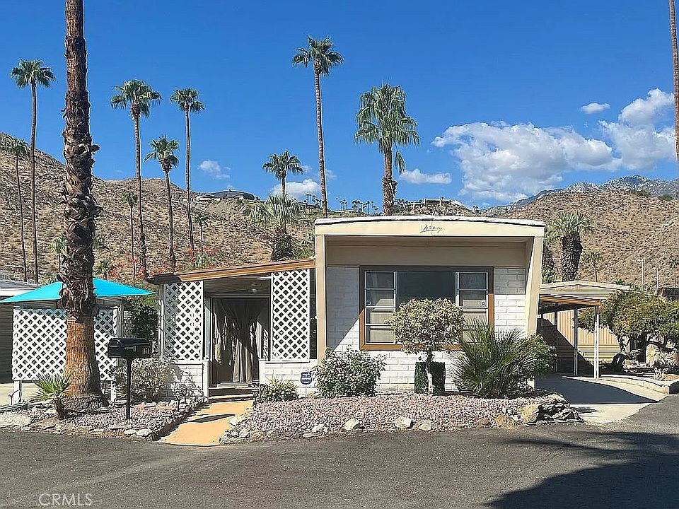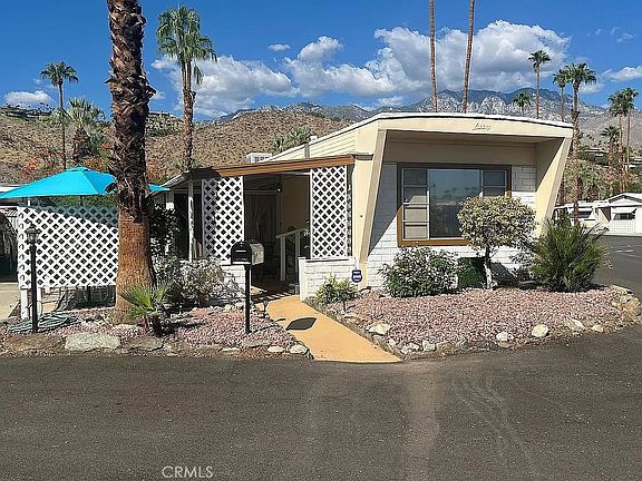 Charming Desert Home - in 55+ Palm Springs Community. Welcome to your desert retreat! This spacious 1-bedroom, 1-bathroom mobile home is ready to move in! Offering 945 sq.ft. which includes the 225 sq.ft. elegant enclosed sunroom. Remodeled throughout, with modern features including new flooring, fresh paint, new fixtures, new trim, and modern lighting throughout. The oversized bedroom offers plenty of space and flexibility to create a second bedroom if desired, or enjoy it as a spacious reading room, office, or mini-gym, the possibilities are endless! The open floor plan seamlessly connects the living room and kitchen, creating an inviting space for entertaining. The kitchen and bathroom feature beautifully refinished Spanish Saltillo tile flooring, adding warmth and charm to the space. The large bedroom provides plenty of closet space, while the bathroom has been refreshed for comfort and style. There is an abundance of closet and cabinet space throughout, including the well-appointed kitchen offering plenty of room for storage and organization. The home features all-new window treatments, including blinds, sheers, and blackout curtains. Covered porch/sitting area plus an additional side patio—perfect for morning coffee, evening refreshments or relaxing outdoors. Covered carport and storage shed add extra convenience and functionality. Enjoy the convenience of in-home washer and dryer hook-ups, giving you extra flexibility. The pre-owned washer & dryer are complimentary (as-is). The park offers great amenities, including a sparkling swimming pool and relaxing hot tub, rec room with pool tables and ping pong, community room, and a clubhouse. Nestled in a peaceful location, this home features beautiful hillside views in a serene setting, away from the city’s hustle and bustle. It is just minutes from shopping, dining, and the vibrant Palm Springs lifestyle. Located in a friendly 55+ senior park , you’ll love the community atmosphere and peaceful ambiance. This home is move-in ready and waiting for its next owner to enjoy all that Palm Springs has to offer! Square footage includes Sunroom which can be used as living space. Currently it is being used as a laundry room, without Sunroom the home is 720 sqft. Carport + storage shed .