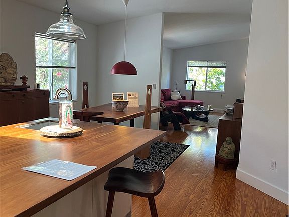 A Japanese-style entry stairway welcomes you into a sun-filled living room where natural light and warmth set the tone. The chef’s kitchen is a true centerpiece, featuring a solid walnut prep island with sink, custom white lacquer cabinetry with pull-out pantry, farmhouse sink, and stainless steel appliances — all illuminated by a Velux vented skylight that flows seamlessly into the adjacent living and dining rooms.