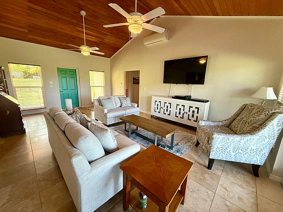Fully air conditioned & pet friendly 3 bedroom, 2 1/2 bath home sits on a lovely lot with a direct Buck Island view. Large kitchen w/ stainless steel appliances, black granite countertops and lots of cabinet space opens to the dining and living rooms flooded with natural light from the french doors and skylights. Enjoy the private main bedroom with en suite, walk-in closet w/ built-in shelving and 2 additional bedrooms with a shared full bath. Fenced yard, cool back patio, laundry room and the coveted connected garage with direct access to the home. Freshly painted inside & out, this home also has a back-up generator on auto transfer. Broadband, Dish and 1x/month cleaning included.