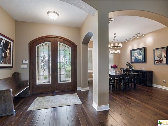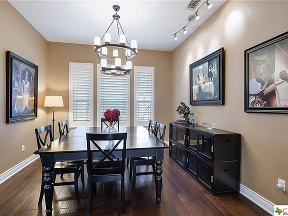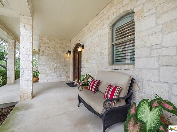 Gorgeous 1 ½ story home in River Crossing. Wonderful expansive front porch, spacious open floor plan w lots of natural light & beautiful Hill Country views. No carpet; hardwood floors in all areas except wet areas. Gourmet kitchen w island, veggie sink, wine cooler, SS appliances, 2 ovens & gas cooktop. Master retreat w sitting area & OS access. Upstairs is a wonderful game room w balcony overlooking pool & Hill Country views + a bedroom & full bath. Private backyard w stunning views & awesome pool & wrought iron fence.