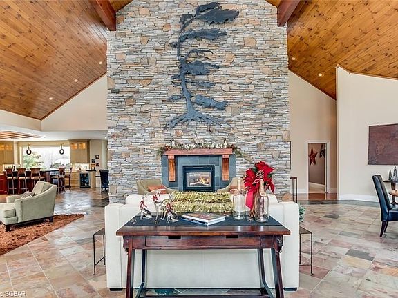 Beautiful property offers the privacy & wide open spaces. A true bungalow on dbl golf course lot. 4 bdrms, 4 baths on 1 main lvl w few stairs. There is high, dry crawl space for storage galore + 3-car garage for your special & everyday vehicles. All fixtures & finishes are quality materials, gourmet kitchen, but piece de resistance is the soaring dbl sided stone f/place w its magnificent Georgian Bay Windswept Pine sculpture. Spacious master suite is its own retreat at far end of the home w 3-sided f/place, sauna & w/out to inviting hot tub in an oasis of greenery. Entire property professionally landscaped w exterior lighting, in-ground sprinklers & extensive decking. Smart-house system remotely controls indoor/outdoor sound, media zones & lighting. Foreign investment tax is n/a. Heat/hydro/water runs approx $566/mth. 2 furnaces & 2 a/c units immaculately maintained, Roof was completely re-shingled in 2016, 1 new a/c unit in 2019. VIRTUAL SHOWINGS HAPPILY ARRANGED!