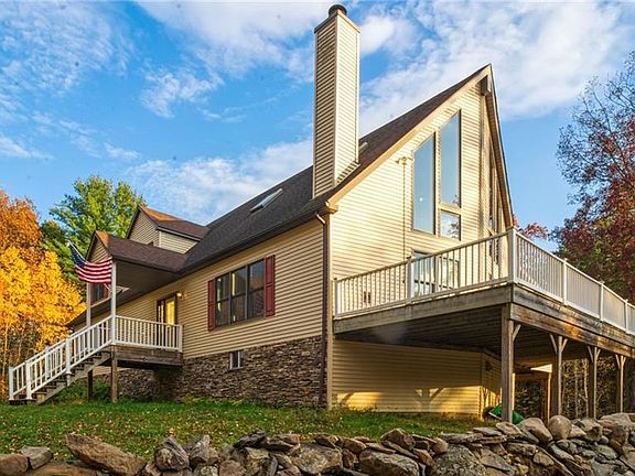 This turnkey, open and spacious 5-bedroom, 2 1/2-bath stunner boasts both style and substance. This meticulously maintained property, surrounded by 51 mostly wooded acres, with a pond & meadow, at the end of a winding driveway, was built with a yearning for seclusion. The home stays bright thanks to cathedral ceilings & light-flooding windows. The 3-season screened-in porch is perfect for relaxing. The main floor, also includes a sizable bedroom with an en suite bath and jacuzzi, a guest room with a half bath next door, a washer/dryer room & large pantry. Upstairs an additional 3 bedrooms, two full baths and a meditative loft area overlooking the main space and the forest & mountains beyond. This 2-car garage property offers the perfect balance of privacy and convenience, located just 3 miles from shopping, dining & cultural activies in Catskill Center & Bard, as well as being close to outdoor activities. Your peaceful retreat awaits, leave your cares behind and just settle on in.