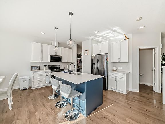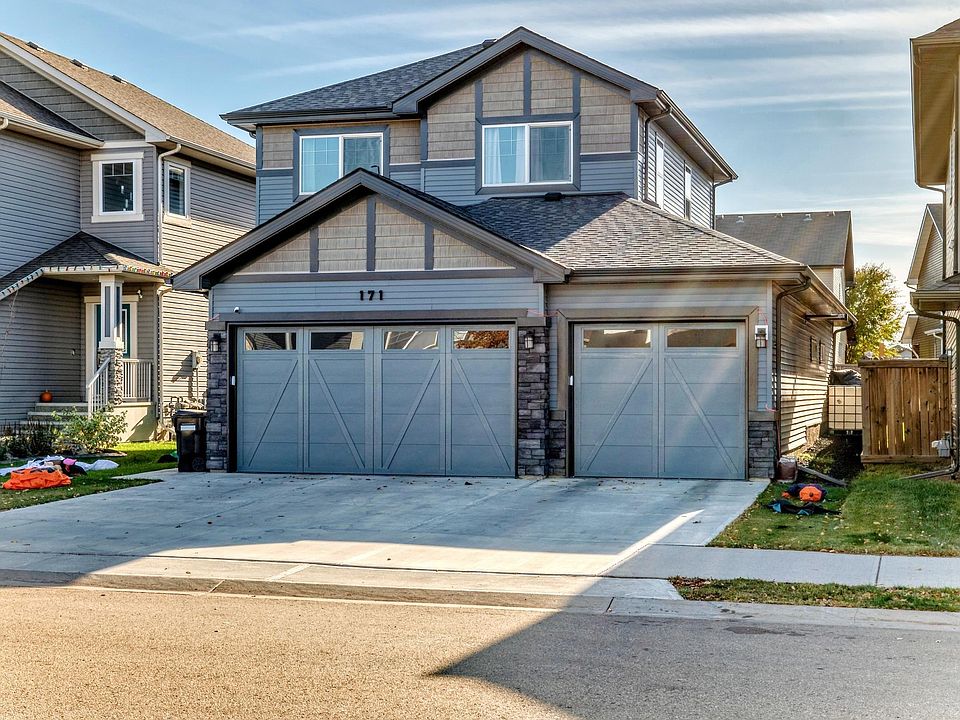 Alquinn Custom built home 2225 square feet of living area & Oversize Garage This garage could fit up to 5 cars! This drive thru garage, has epoxy flooring, heater, rear garage door, backyard powered gate to the back lane. This home features all the upgrades including central air conditioning, Astro lights and upgraded black stainless steel appliances, The basement is completely finished (PERMITTED) with a huge family room, full bathroom with heated floors and a large bedroom. Upstairs boasts a large movie room . Enjoy your back deck with composite decking . This home is a must see in a great community! Located close to schools and playgrounds. Come check out this home and all it has to offer! Fully finished, just move in and enjoy! South backing yard! blinds will stay. tall Gray shelves stay