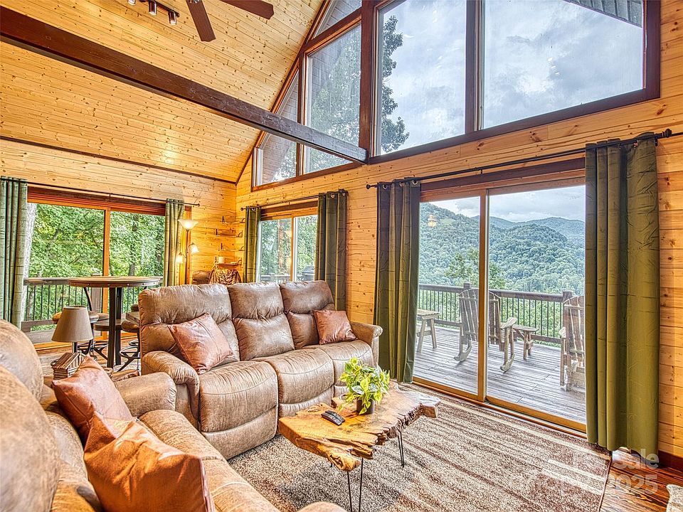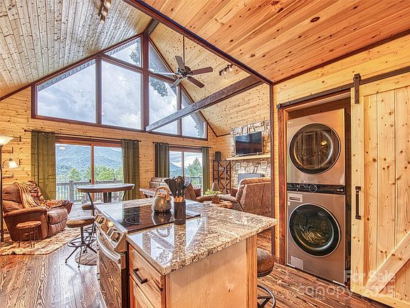 Mountain viewsModern touchesWood-burning fireplaceWraparound deckWalk-in showerGranite countertopsMassive windows