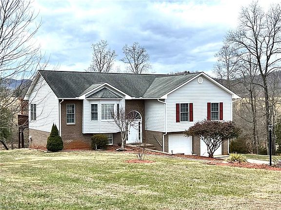 Tucked away at the end of a cul de sac in Purlear, NC, this Immaculate 3 BR 2 1/2 BA home is situated on nearly 3 acres, borders a creeK and it has amazing mountain views! Other features include hardwoods, tile, Great room w/ rock fire place, arched doorway to Dining room, Well-equipped kitchen with Stainless appliances & Granite counters, , Central vac, Main level laundry room, Oversized primary bedroom with 2 additional bedrooms on the main level. The deck on the back of the home has a pergola and overlooks the manicured yard. Finished basement has a den and half bathroom and plenty of storage. New heat pump Dec. 2024!