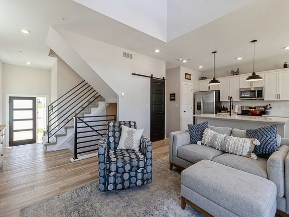 Are you in search of a modern townhome that exudes luxury? Look no further! This stunning, like-new home is situated in the desirable NW side of Grimes, within the 44 West community, close to DCG High School. As you arrive, the 2-car attached garage and quality cement board siding will catch your eye, along with the lush, irrigated green lawns. Step inside to find a convenient locker system and a half bath near the garage entry. A few steps up, you'll enter the open kitchen, which features white cabinets with soft-close drawers, quartz countertops, stainless steel appliances, and a spacious dining area. The great room boasts 18-foot ceilings, a linear fireplace, and LVP flooring for easy maintenance. A wall of windows floods the space with natural light, leading to a covered deck with steps to the front yard. Upstairs, the primary suite includes a walk-in closet, a private bath with a tiled shower and dual vanities, a second bedroom, a full bath, and a handy office nook. The finished lower level offers a third bedroom, a full bath, a second great room, and plenty of storage space. With low HOA dues and a pet-friendly policy, this home is a must-see!