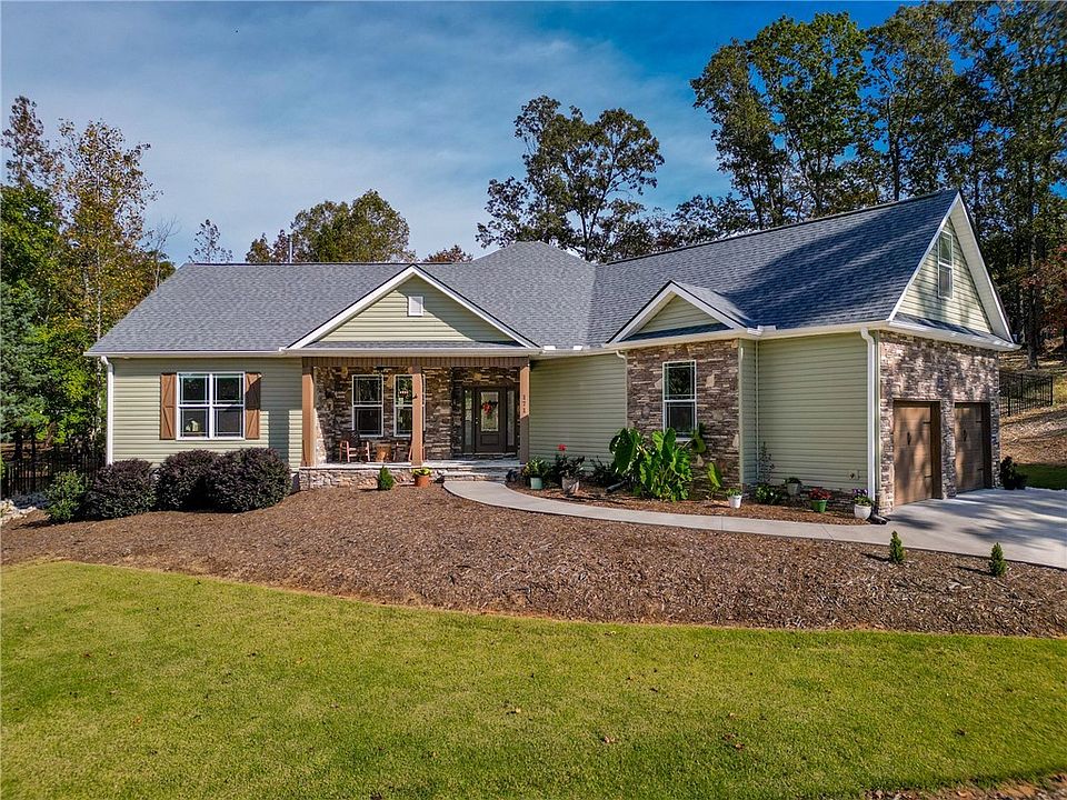 The private primary suite includes elevated ceiling details, a spacious tiled shower, and a large walk-in closet. Two additional bedrooms on the opposite side of the home share a full bath, providing comfortable space for guests or family. A floored bonus room above the garage offers future flexibility for storage, a home office, or an additional bedroom, while the oversized garage provides room for hobbies, lake gear, or workshop use.