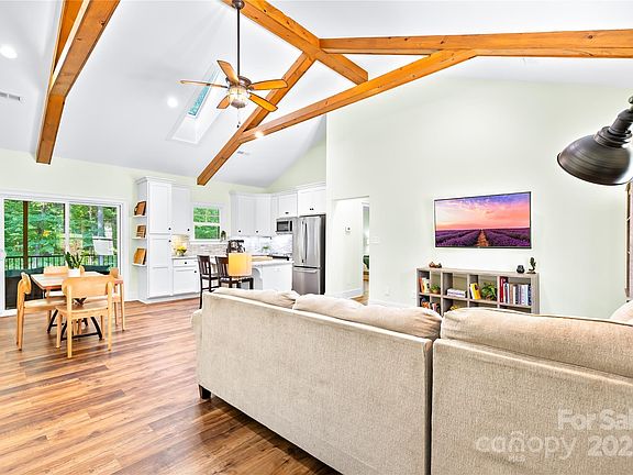 Custom-built ranch on a .82-acre lot backed by stream and woods! The open floor plan stuns with vaulted ceilings, exposed beams, recessed lighting, and wide-plank wood-look flooring. The dream kitchen features granite countertops, soft-close cabinets, tile backsplash, stainless appliances, a lazy susan, under-cabinet lighting, and a skylight over the island. The split 3BR/2BA layout includes a spacious primary suite with a custom walk-in closet. Stylish fans, granite bath counters, central vacuum, and ample laundry room storage add comfort and convenience. The heated and cooled garage has pull-down stairs for attic access. Don't miss the full walk-out basement, framed and plumbed for a bath—ready to finish as you wish. Relax on the front porch, screened deck, covered patio, or in the fenced backyard. Open the back gate to a footbridge over the stream to the woods beyond. Close to Lake Norman State Park, Mooresville, and Troutman, yet tucked away in a quiet neighborhood with no HOA!