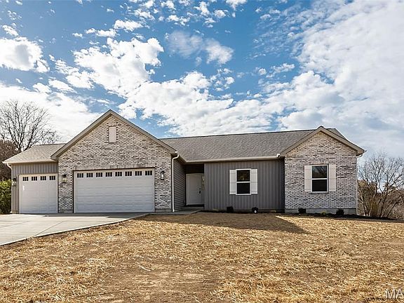 Brand new ranch home on nearly 3 acres of level, private ground—ideal for a future pool, detached garage, or simply enjoying wide open space. Located in a low-restriction, 21-lot development with homesites ranging from 3 to 6 acres, this is the closest new home subdivision off blacktop near town with public water and easy access to amenities. Thoughtfully designed and packed with upgrades, this home features nine-foot ceilings on the main level and a full nine-foot pour in the lower level, an oversized three-car garage, bay window, walk-out patio, and a beautiful brick and board-and-batten exterior with architectural shingles. Inside, you’ll find high-grade luxury vinyl plank flooring, a full stone wood burning fireplace, and real custom cabinetry with crown molding. The kitchen offers quartz countertops, upgraded appliances, and plenty of workspace and storage. Main floor laundry adds everyday convenience. The primary suite includes his and hers closets, a double adult-height vanity, and an oversized walk-in tile shower. The lower level is ready to grow, with an egress window and full bathroom rough-in already in place. Offered at a builder spec discount, this home delivers exceptional value in a premium setting.