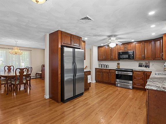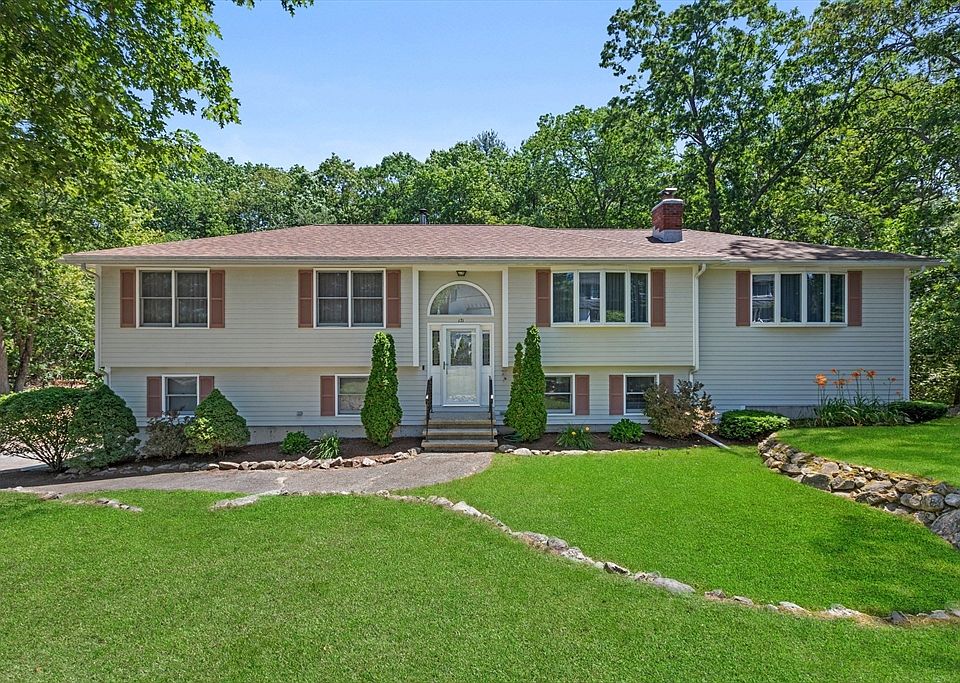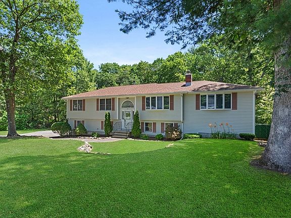Welcome to this beautifully maintained raised ranch offering 9 total rooms, including 4 generous bedrooms and 2 baths. Nestled on a serene 0.77-acre wooded lot, this home offers both comfort and privacy, The main level features an open and airy, hardwood Floors, eat-in kitchen with granite countertops /breakfast bar, sliders leading out to a private deck, perfect for morning coffee or summer entertaining. The spacious family room also includes sliders to the deck, creating a great flow for indoor-outdoor living. Enjoy hardwood floors throughout the main level and stay comfortable year-round with 3-zone forced hot water heating and central air. Newer roof & new leach Field. The lower level offers incredible in-law potential with 3 additional rooms, a full bath, and a cozy wood-burning fireplace—ideal for extended family, guests, or a private home office setup. Step outside to a screened-in patio for a peaceful retreat surrounded by nature & 1 car garage. Convenient to major highways.