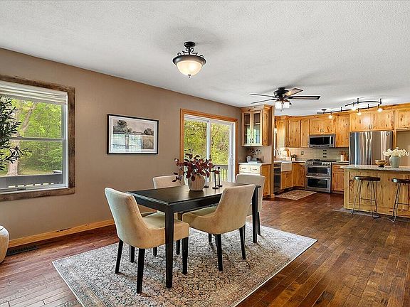 Tucked on 10 private acres, this move-in ready two-story home blends rustic charm with modern updates. The main floor features an open layout with rich hardwood floors, an updated kitchen with solid surface countertops, stainless steel appliances, and warm cabinetry—perfect for entertaining or everyday comfort. The living room offers wood accents, a large picture window, and great natural light. Upstairs, retreat to a 700 sq ft owner's suite with a jetted tub, dual vanity, and peaceful wooded views. Outside, enjoy total privacy and two 30x40 pole barns ideal for toys, hobbies, or a workshop. Just minutes from US-131—country living made easy.